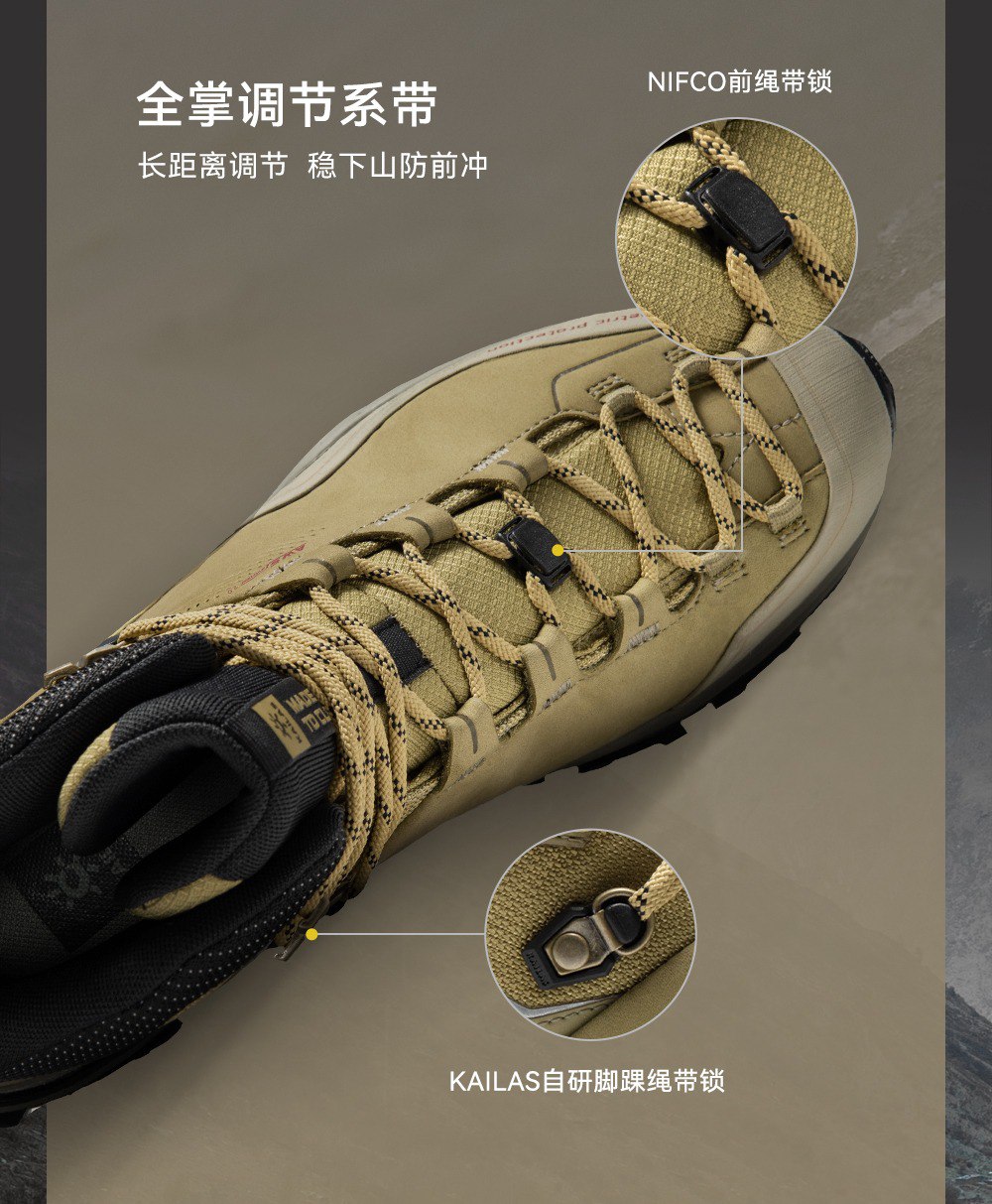 در قسمت پنجه و پاشنه، لبه لاستیکی محافظ تعبیه شده که هنگام برخورد با سنگ ها از پا و رویه محافظت میکند. این قابلیت بهویژه در مسیرهای فنی و سنگلاخی اهمیت دارد و عمر کفش را بهطور چشمگیری افزایش می دهد. سیستم بند KAILAS AWS با ترکیب دو نوع سگک نیز امکان تنظیم سریع، دقیق و کاملاً شخصی سازی شده را فراهم می کند تا در هر شرایطی بهترین فیت روی پا ایجاد شود؛ چه در مسیرهای صعود که نیاز به فیکس بودن بیشتری است و چه در مسیرهای فرود که باید فضا کمی آزادتر باشد.